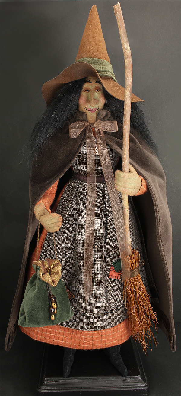 (The exact Elmira available is shown in the photograph. We use no molds for their faces, making each one truly one-of-a-kind. Elmira, and all her accessories (with exception of her pewter spider charm and doll stand), are made in our workshop. She is signed by the artists.)